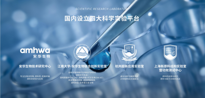 目前安华生物设立了四大科学实验平台——安华生物技术研发中心、江南大学&安华生物联合创新实验室、杭州超新应用实验室、上海新原料组构实验室暨功效测试中心。