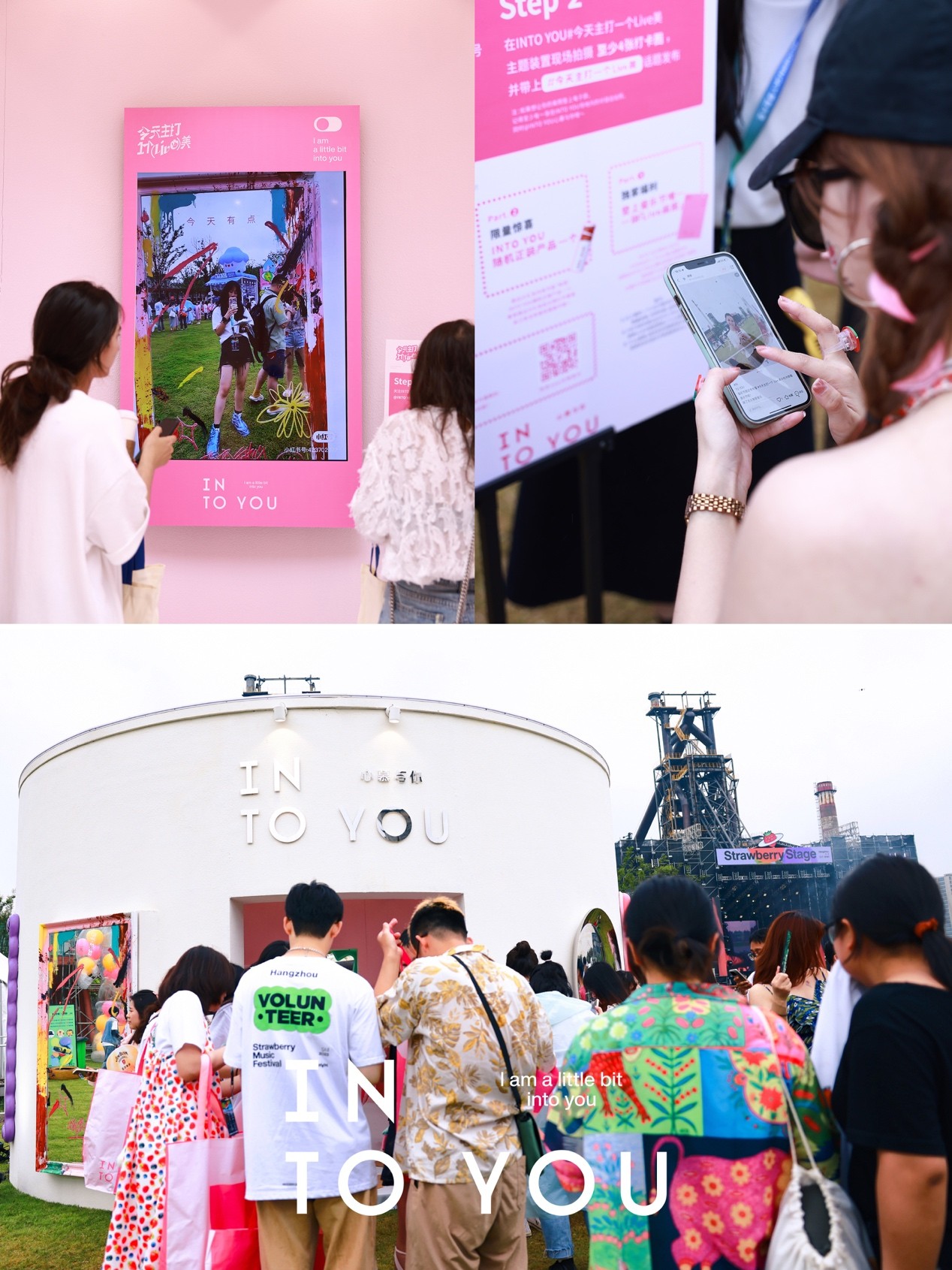 为此,场地内还设有音乐节唯一一块Live画报供打卡!活动当天吸引到超多不同风格的草莓星人来上墙,堪称音乐节现场最具Live美的一块大屏~不定时出现的小雨也毫不影响热烈的互动氛围,INTO YOU的展位门口始终排着长队,打卡者络绎不绝!
